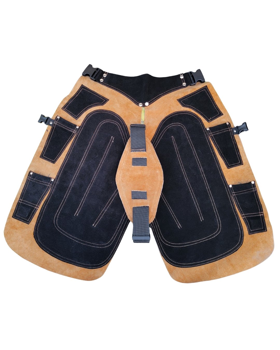 Protect and organize like a pro with our premium leather farrier apron (also called farrier chaps) – the ultimate protective and functional gear for farriers, equine farriers, blacksmiths, and horse owners during hoof trimming, shoeing, nailing, and therapeutic work. Made from heavy-duty suede leather with reinforced black panels, this design offers exceptional durability, comfort, and smart features like a strong built-in magnet to securely hold horseshoe nails right on your thigh for instant access.