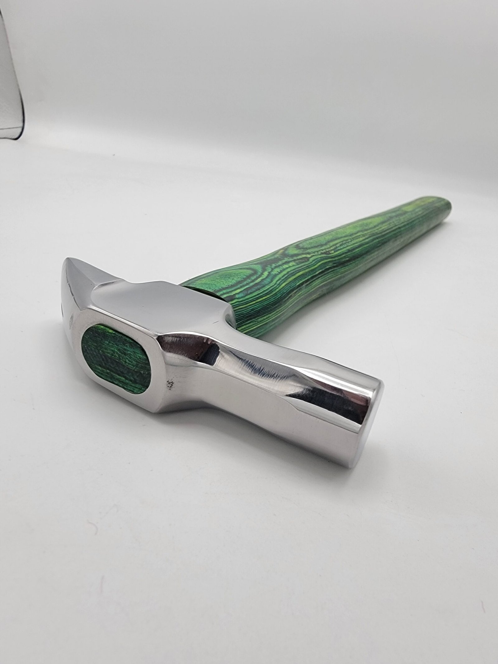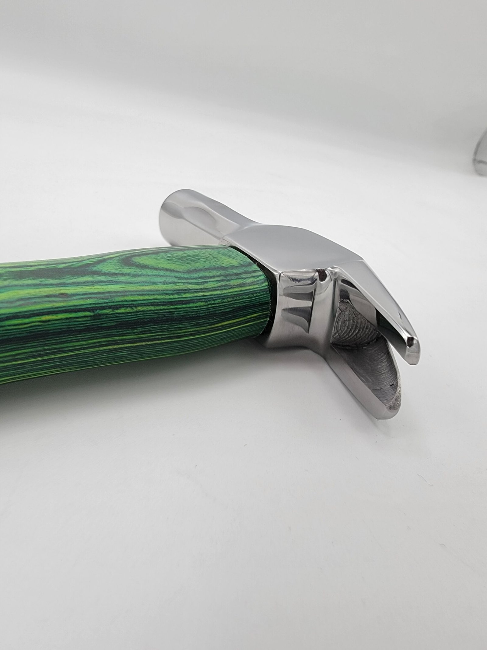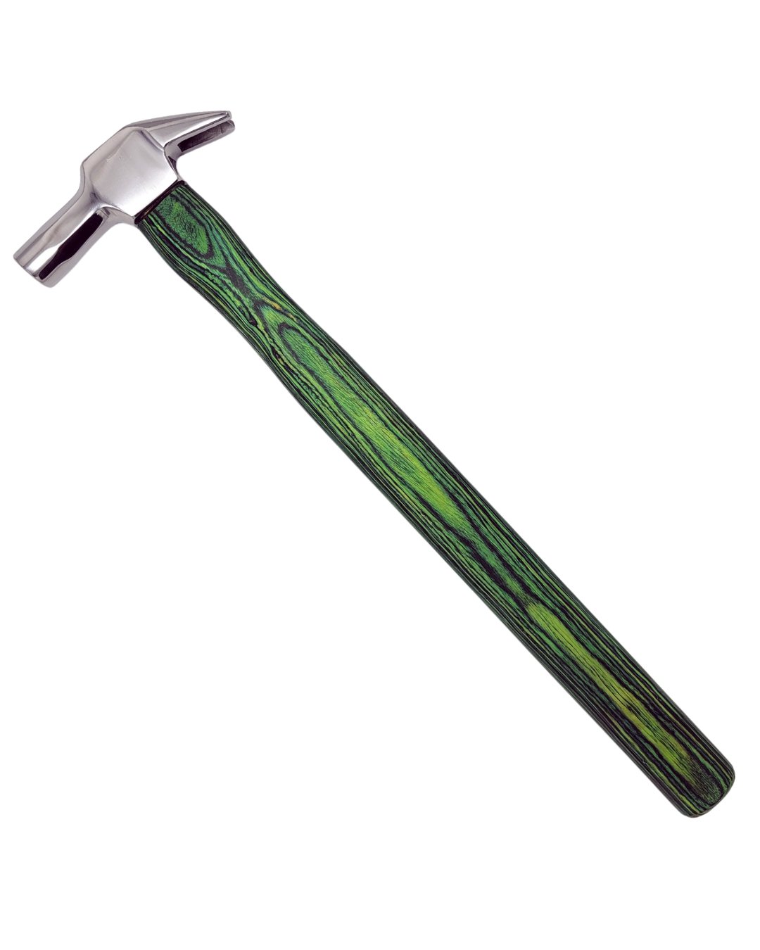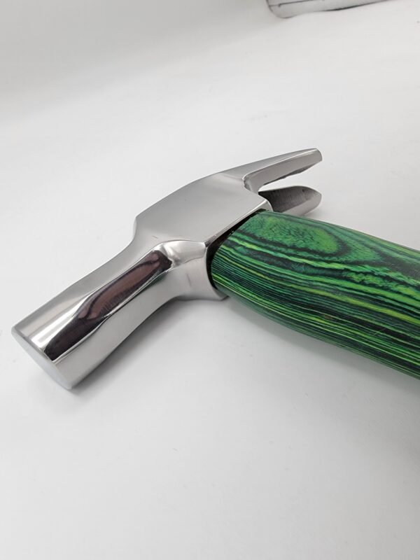 Featuring a high-quality forged steel head (polished flat face for powerful strikes, claw for setting/clinching nails or corrections) and a vibrant green laminated wooden handle with eye-catching striped grain for superior grip, reduced vibration, and all-day comfort.