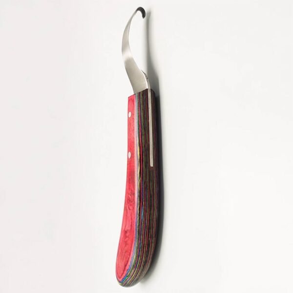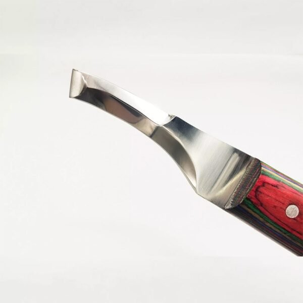 Equipped with a high-performance J2 steel blade (premium Japanese stainless steel prized for superior hardness, outstanding edge retention, and excellent corrosion resistance), this horse hoof knife provides clean, smooth, and effortless cuts through tough hoof walls, soles, frogs, bars, and white line areas with long-lasting sharpness and minimal resharpening. The curved blade profile offers excellent reach into frog pockets and tight hoof spaces, while the polished stainless steel tang integrates beautifully into a striking multi-layer resin-stabilized wooden handle (vibrant red dominant with layered green, blue, brown, and natural wood grain patterns, secured by brass rivets) for a secure, comfortable, non-slip grip and standout artistic appeal.