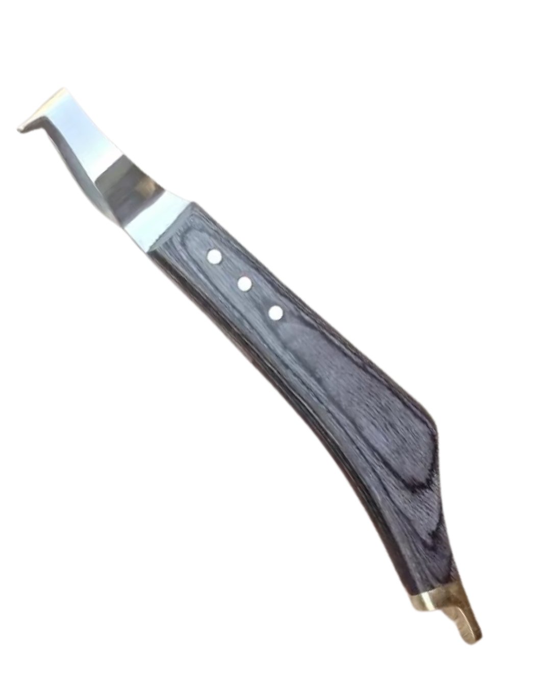 Professional Loop Knife with Hook Tip & Dark Stabilized Wooden Handle – specialized farrier trimming tool engineered for precise loop cutting, hooked detailing, and advanced hoof work on horses, ponies, donkeys, goats, sheep, and livestock.